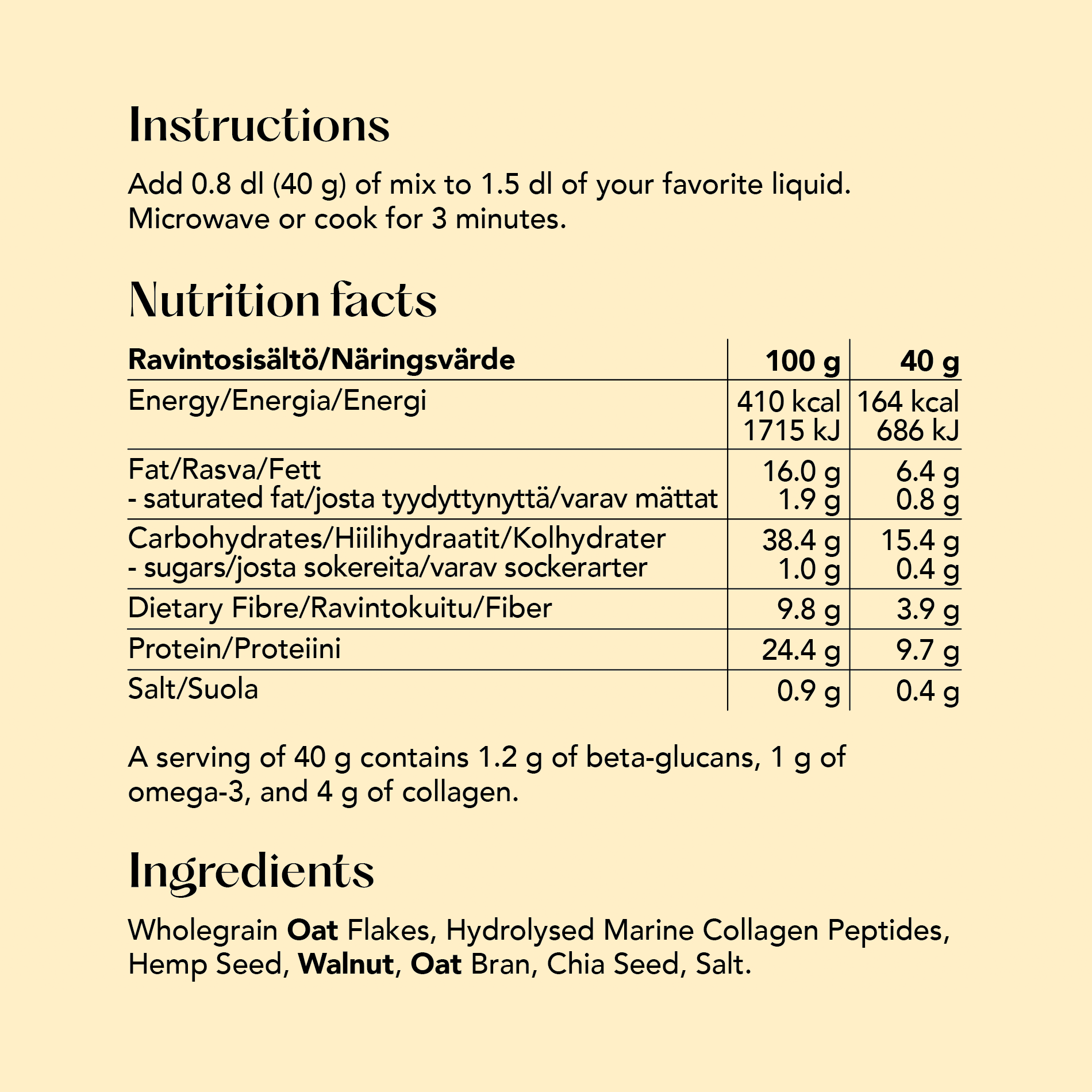 Ainesosat: täysjyväkaurahiutale, hydrolysoitu kalakollageenipeptidi, hampunsiemen, saksanpähkinä, kauralese, chia-siemen, suola